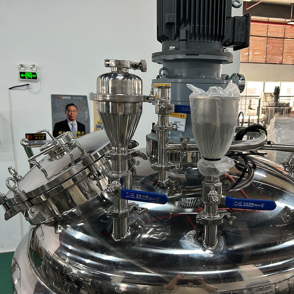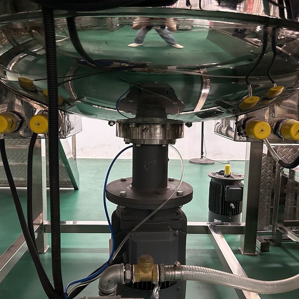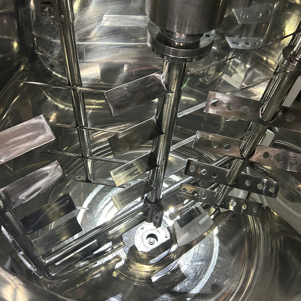 Liquid vacuum cosmetics emulsifier mixer is a device designed to mix ingredients used in the production of liquid detergent. It typically consists of a tank, a motor, a mixing blade, and various sensors and controls. The tank is usually made of stainless steel and is used to hold the raw materials used to make the detergent. The motor powers the mixing blade, which is responsible for blending the ingredients together. The sensors and controls on the machine help to regulate the mixing process, ensuring that the ingredients are thoroughly mixed and that the mixture remains at the desired temperature and consistency.